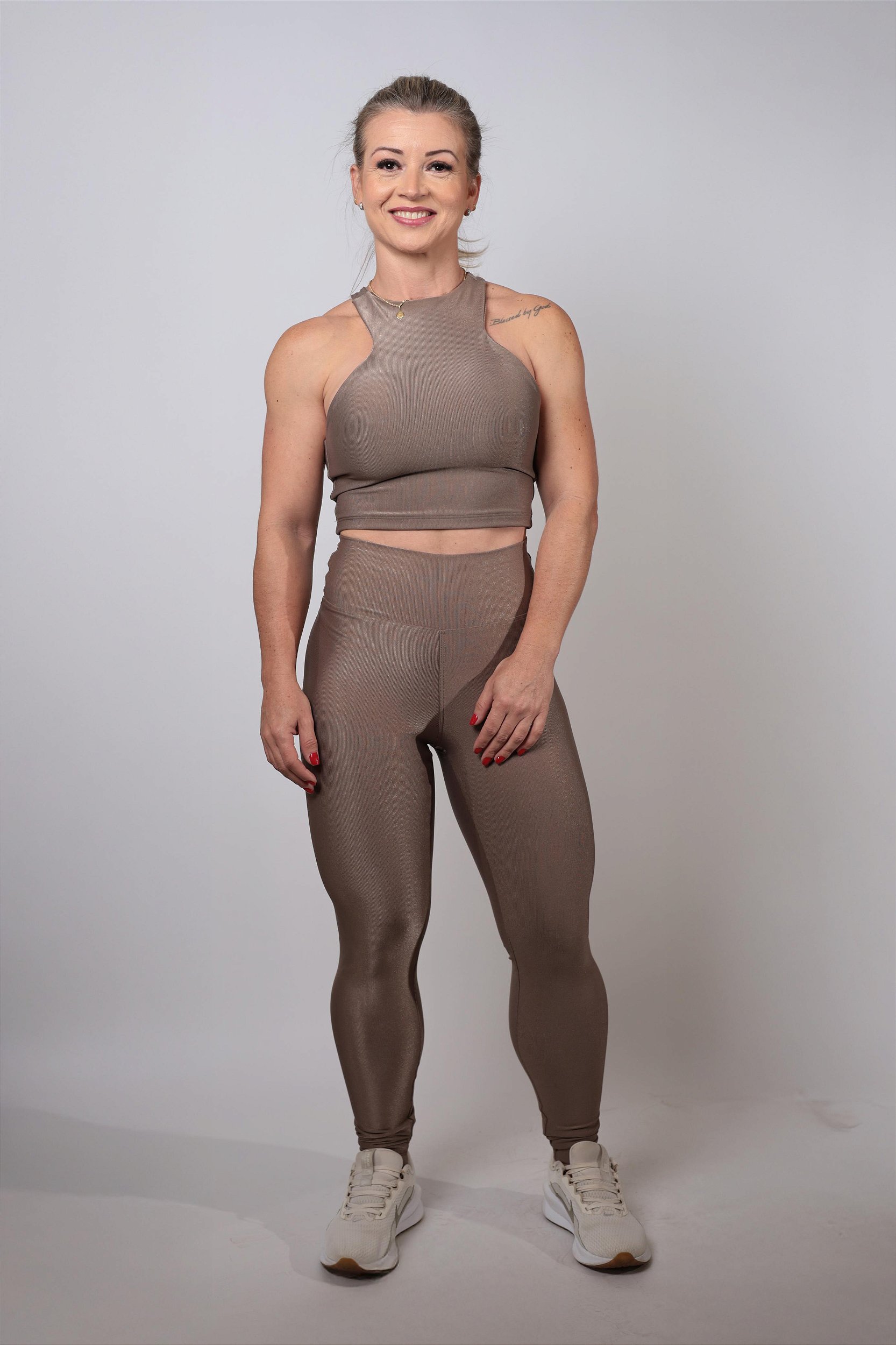 Conjunto Castanho Wonder, tecido tecnológico canelado com brilho que valoriza o corpo e disfarça as importações, alto conforto, facilita os movimentos, compressão com conforto, perfeito para um treino cheio de estilo e personalidade.